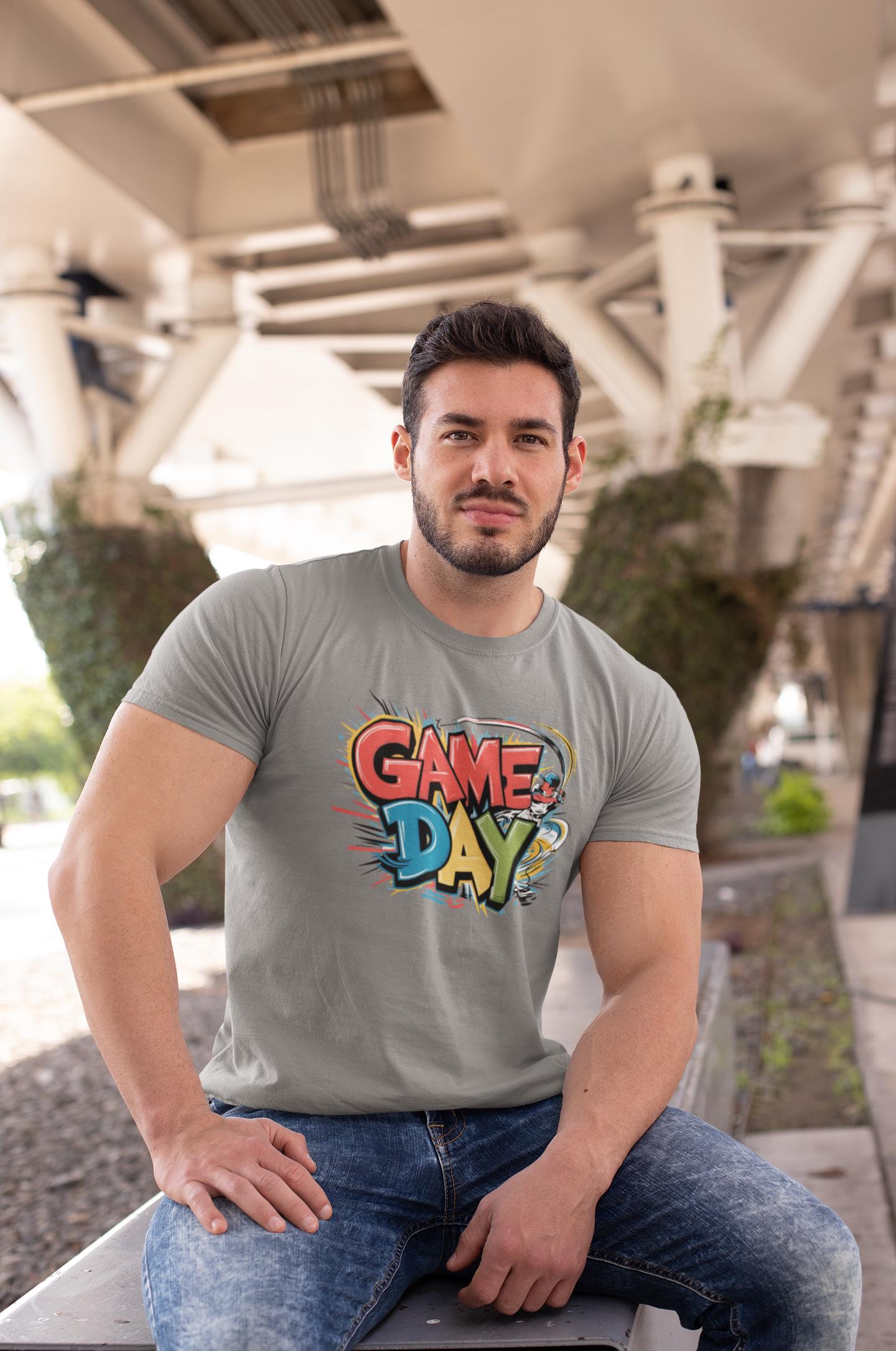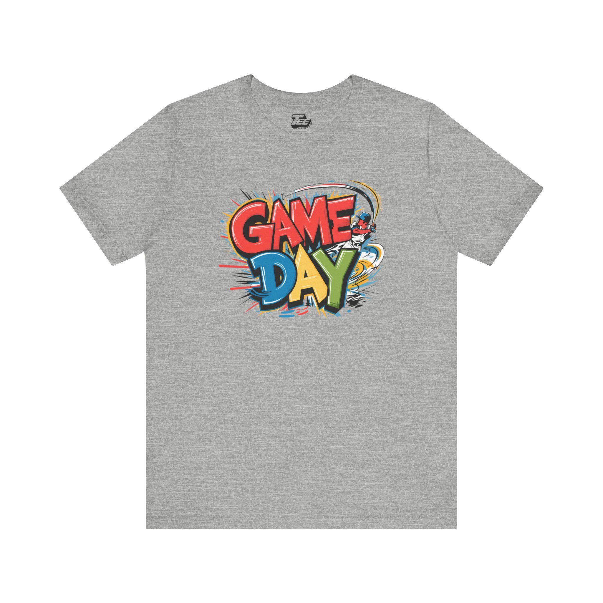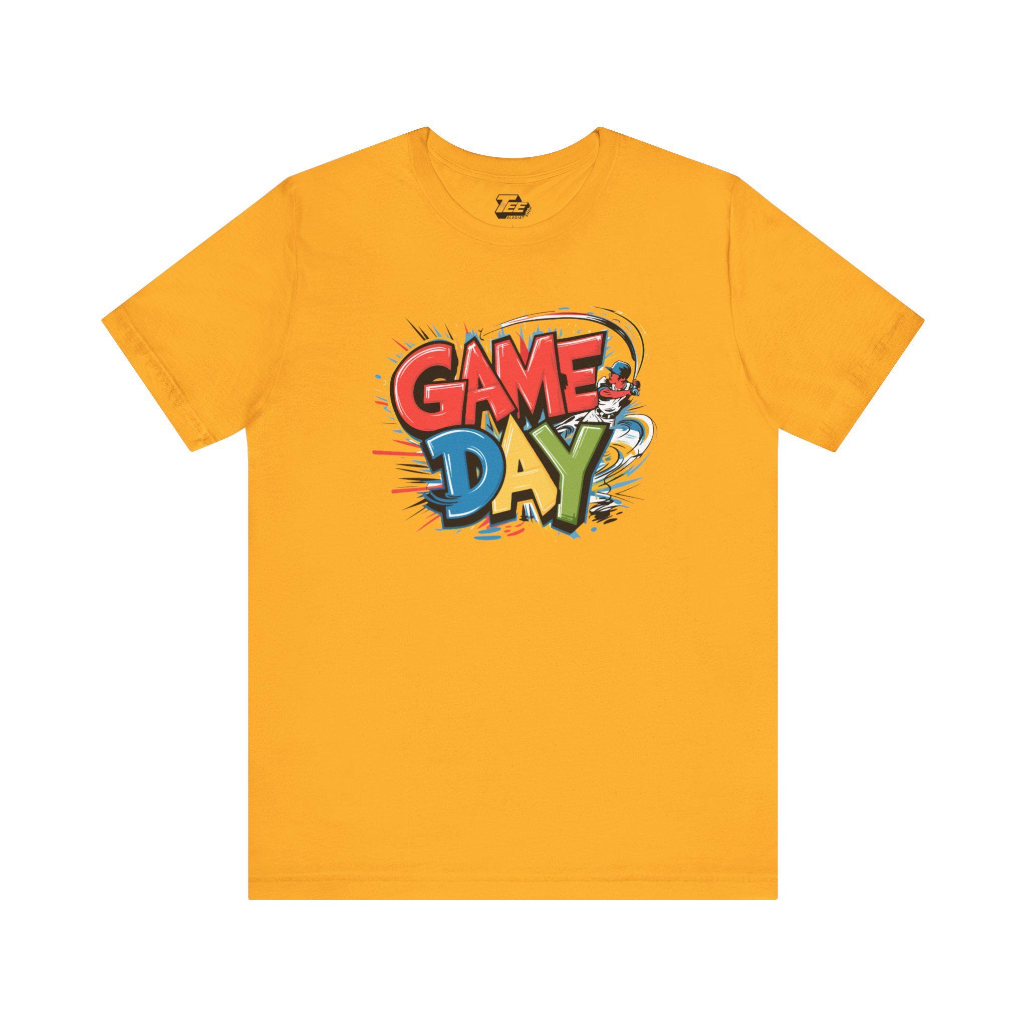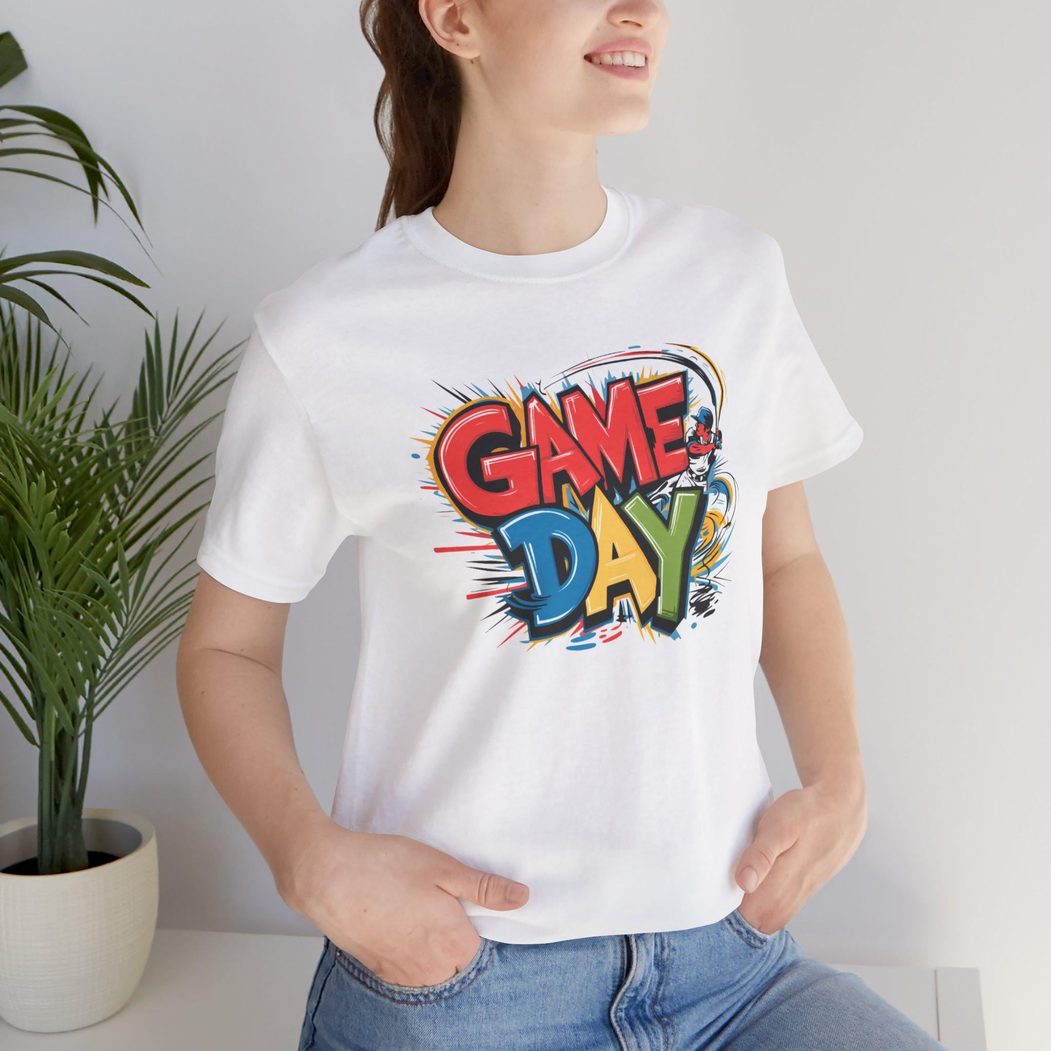 Colorful game day baseball tee shirt perfect for sports fans and casual wear. Made with 100% lightweight and breathable cotton, featuring a retail fit and tear-away label for added comfort. Ideal for adults and suitable for active and leisure wear. Relevant for sports events, game days, and casual outings.