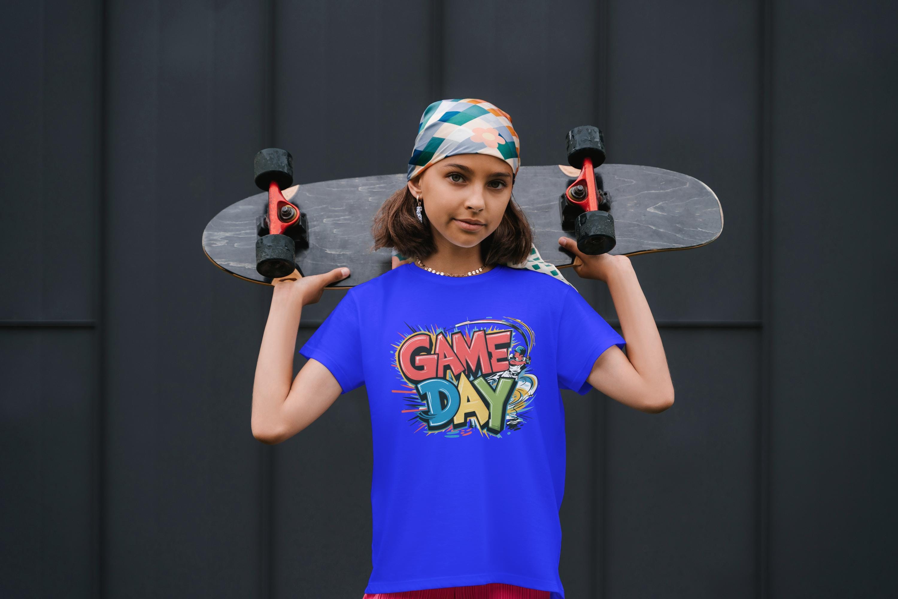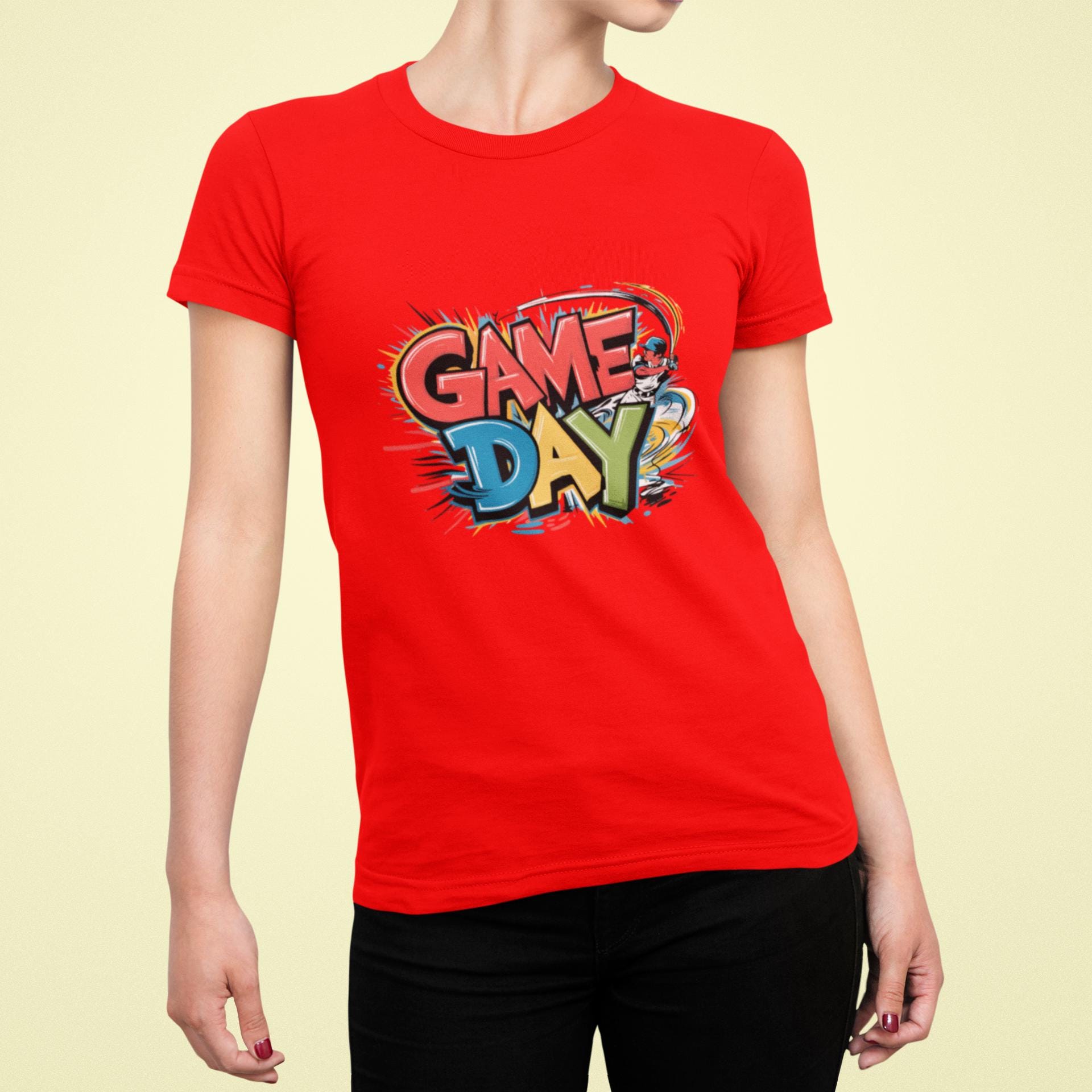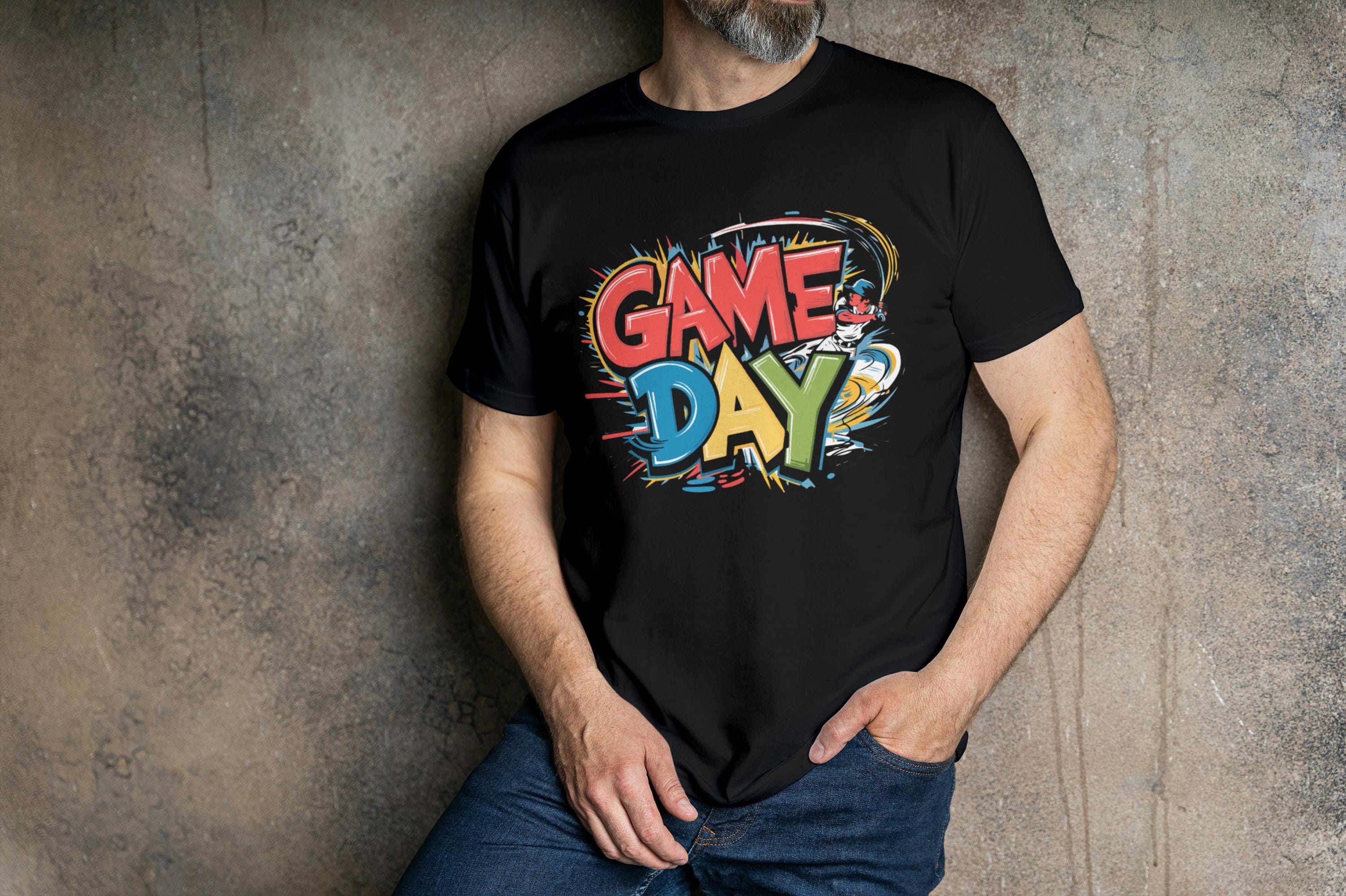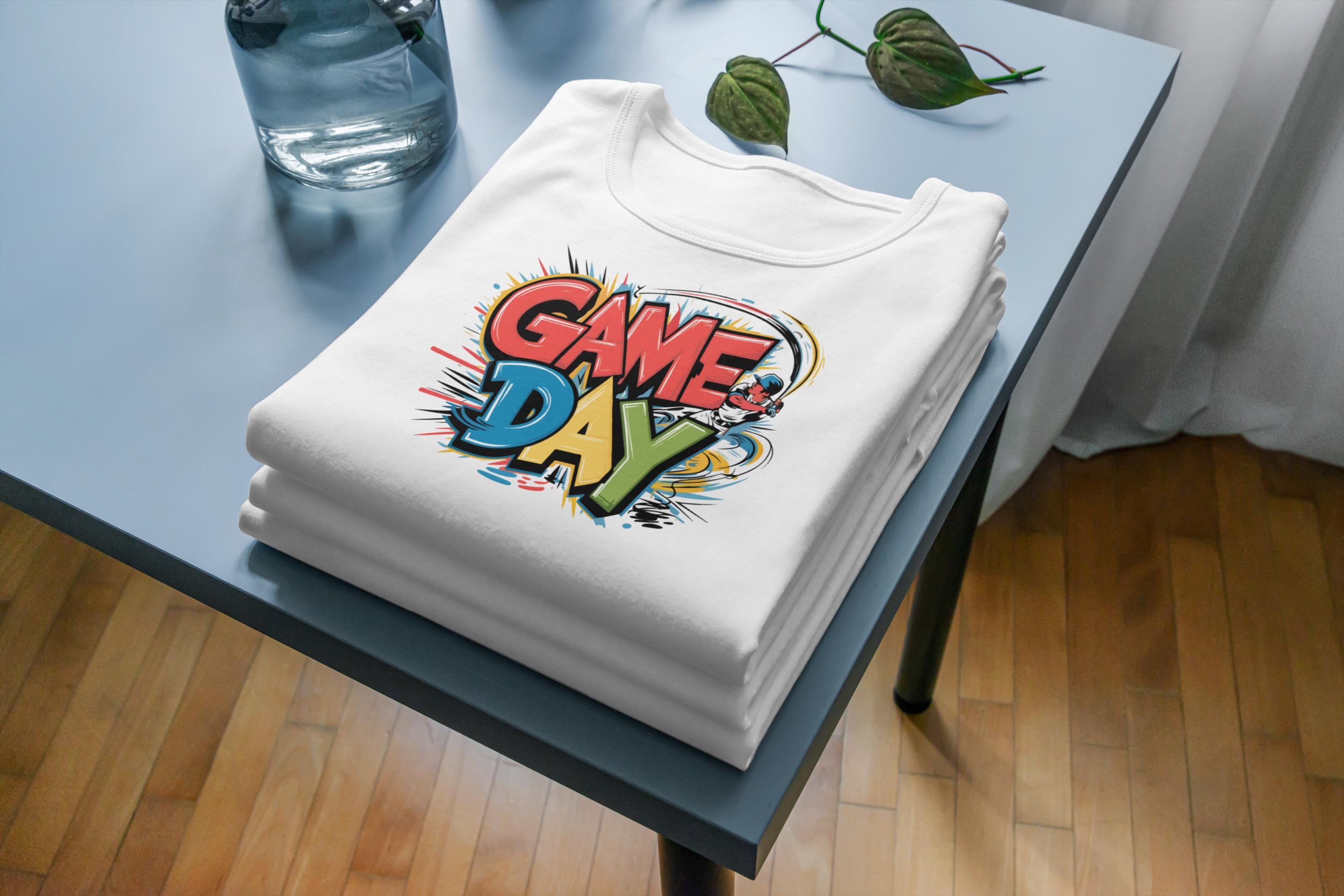 Colorful game day baseball tee shirt perfect for sports fans and casual wear. Made with 100% lightweight and breathable cotton, featuring a retail fit and tear-away label for added comfort. Ideal for adults and suitable for active and leisure wear. Relevant for sports events, game days, and casual outings.